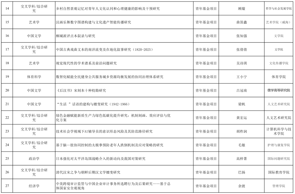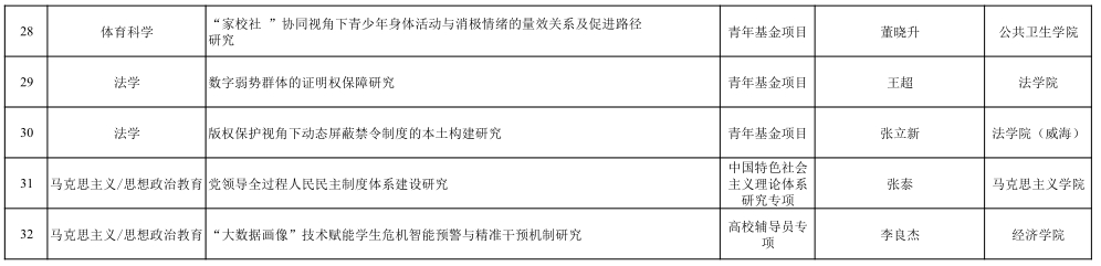 在规划基金项目和青年基金项目中,山东大学教师在数字治理、文化传承、国际关系、人工智能与社会发展、健康人文、绿色金融等前沿领域均表现突出,多项课题聚焦国家重大需求与学术前沿问题,具有较强的理论价值与现实意义。