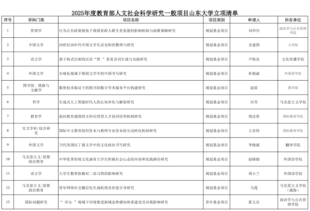 [本站讯]近日,教育部社会科学司公布2025年度教育部人文社会科学研究一般项目立项结果,山东大学获批32项。在规划基金、青年基金、自筹经费项目,西部和边疆地区项目,新疆项目,西藏项目立项结果中,山大获批30项,立项数位列全国高校并列第一,连续三年居全国首位。