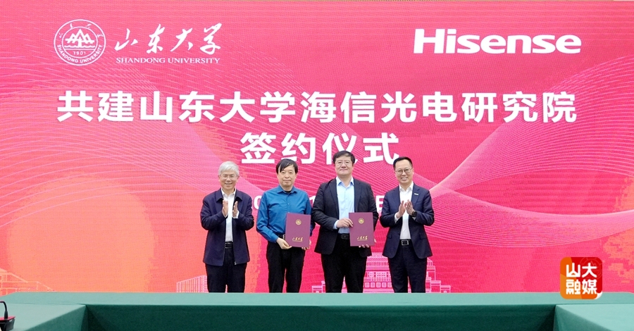 李术才与贾少谦共同为山东大学海信光电研究院揭牌,并为研究院院长、信息科学与工程学院教授黄卫平,企业联席院长、海信集团激光显示首席科学家刘显荣颁发聘书。王美琴与李炜签署《山东大学海信光电研究院共建协议》。