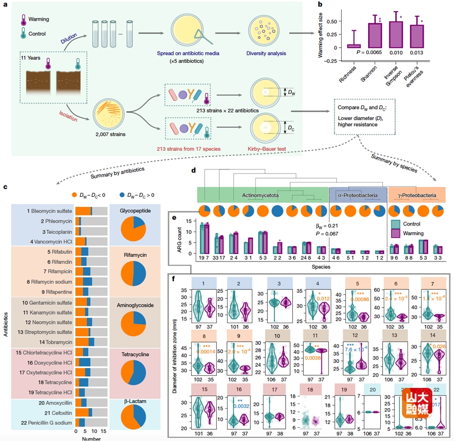 [本站讯]4月22日,山东大学海洋学院、微生物改造技术全国重点实验室穆大帅教授团队联合北京大学吴林蔚研究员团队、美国俄克拉荷马大学Jizhong Zhou院士团队等多家单位,在国际顶尖学术期刊Nature发表题为“Decade-Long Warming Accelerates Antibiotic Resistance in Grassland Soils”的研究成果。该研究通过长达十年的野外实验与大规模微生物分离培养,揭示了气候变暖如何通过生态选择与进化耦合机制,显著加剧土壤环境中的抗生素抗性基因(ARGs)扩散,为从“One Health”视角评估气候变化带来的公共健康风险提供了关键科学依据。