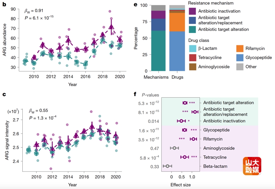 针对这一科学问题,研究团队基于在美国俄克拉荷马州建立的野外长期增温实验平台(2009-2020年土壤样品),结合宏基因组测序、功能基因芯片及大规模微生物纯培养与表型验证等技术手段,研究发现十年增温显著提升土壤抗性基因丰度:长期(+3°C)实验增温使土壤中抗生素抗性基因总丰度平均提高23.9%,尤其是糖肽类和利福霉素类抗性基因显著富集;通过大规模细菌菌株分离培养和耐药性分析,发现增温条件下的菌株表现出显著增强的多重抗生素耐药性。