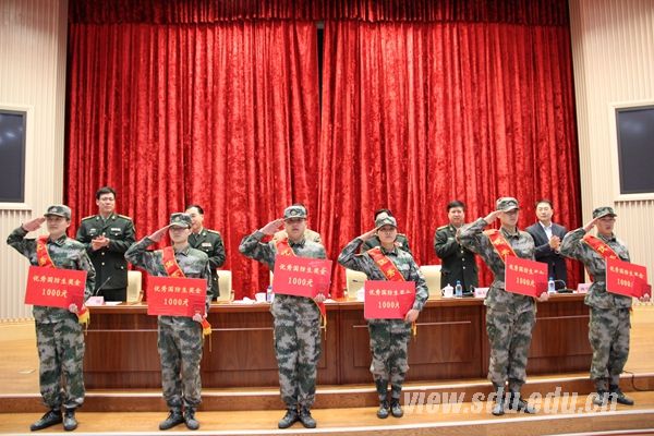 山东省军区政治部副主任吴巨峰大校对“牢记强军目标、献身强军实践”主题教育活动作了部署;驻山东大学、烟台大学选培办主任王强上校宣读了济南军区政治部干部部《表彰2013年度军区优秀国防生》的通报。山东大学党委学生工作部部长曲明军主持会议,济南军区综合训练基地学生军训教研室主任刘鹏大校等参加会议。与会领导为16名军区优秀国防生颁发了证书和奖金。