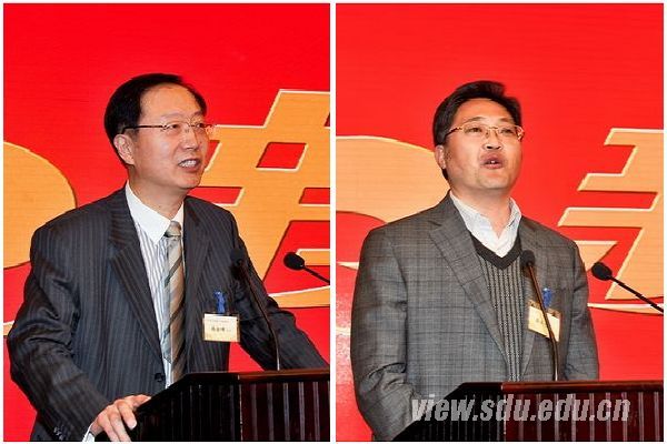 山东大学校友、山东省委组织部副部长、人社厅厅长韩金峰(左),山东省省立医院院长秦成勇(右)先后致辞
