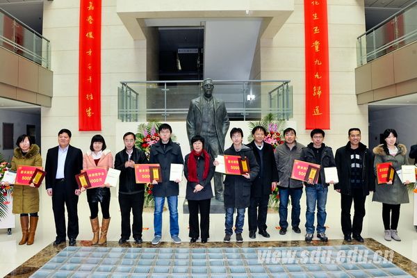 山东大学数学学院院长刘建亚宣读了2012年度潘承洞奖学金获奖名单,郑学欣等六名同学获奖。校友代表、鼎晖投资公司总裁焦震,潘承洞先生弟子、山东大学王小云教授等为获奖同学颁奖。学生代表向潘承洞先生的铜像敬献花篮,全体在场人员向铜像三鞠躬,表达了对潘承洞先生的崇高敬意和深切缅怀。