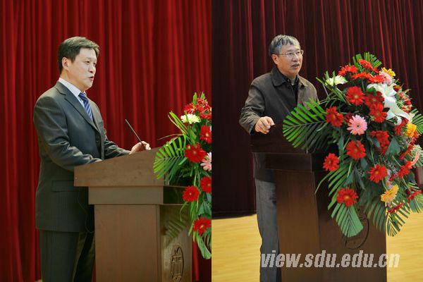 山东大学数学学院院长刘建亚在庆典上讲话(左),数学学院党委书记鲁统超主持庆典(右)