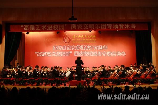 自2007年以来,中央交响乐团、国家京剧院和中央歌剧院等国家级艺术团体先后来到山东大学,为山大师生带来了多场经典文化盛宴。在学校110周年校庆来临之际,山东大学立足于扎实的学术素养和广阔的文化基础,以“学术校庆、文化校庆”为主题举办了一系列主题鲜明、内容丰富、特色突出的庆祝活动,此次专场音乐会便是庆祝山东大学建校110周年系列文化学术活动之一。