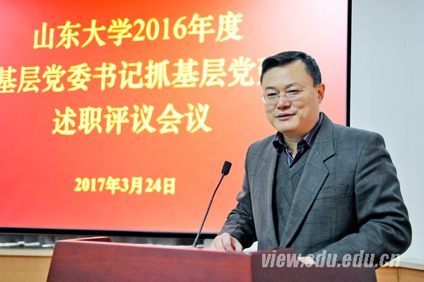 [本站讯]按照中组部、教育部党组有关部署要求,3月24日上午,山东大学2016年度基层党委书记抓基层党建述职评议会议在中心校区举行。校党委书记李守信对参加现场述职的15个单位党组织书记逐一进行了点评并作总结讲话,校长张荣主持会议。