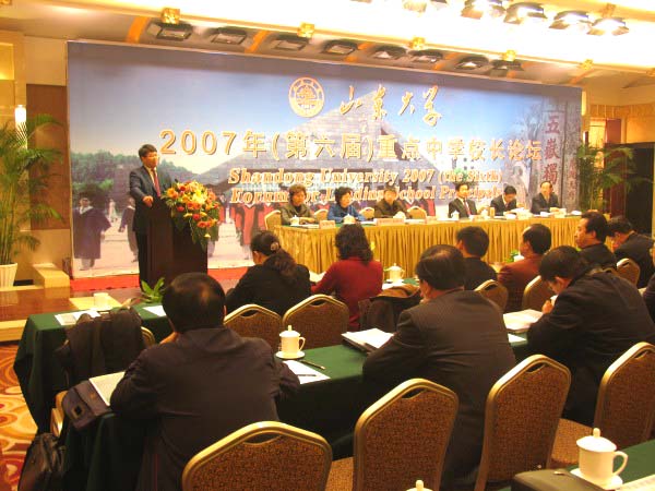 [本站讯]11月22至23日,山东大学2007年(第六届)全国重点中学校长论坛在泰安举行。来自全国17个省的近140所重点中学校长参加了论坛,共商新课改背景下的创新型人才培养、高校人才选拔以及大学与中学教育的衔接与合作等问题,并积极为山大的教育拓展及招生工作建言献策。山东大学校长展涛、山东省教育招生考试院院长王坦、泰安市副市长齐成芳、山东大学副校长樊丽明出席了大会。