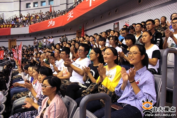 典礼前播放了精心制作的新生报到和军训回顾视频,让同学们感到既激动又暖心。入学报到时神情中的期待和一丝忐忑,军训中日渐坚毅的眼神和整齐划一的动作,拉歌、休息时飞扬的神采和大家逐渐拉近的距离……看到入学十几天来的点滴成长被敏锐捕捉和用心记录,同学们热情鼓掌,欢欣鼓舞,掌声与笑声连成一片。大屏幕上的镜头移到到哪里,哪里就爆发出一阵山呼海啸般的欢呼。他们热切地期盼山大生活的正式开启。