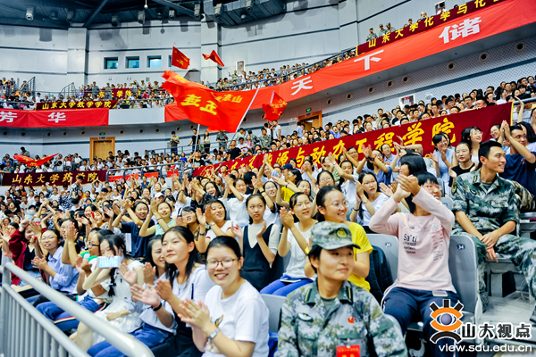体育馆外艳阳高照,体育馆内一派朝气蓬勃。新生们的脸上洋溢着青春与活力,眼眸中闪动着希翼与向往。典礼开始前,体育馆内旗帜翻飞,新生振臂高呼,激情呐喊,喜悦与激动在脸上满溢。各学院纷纷秀出自己的口号,能源与动力工程学院的“能文能武能动人,动天动地动乾坤”,自信而又霸气,让人热血沸腾;临床医学院的“敦学力行,广治求真”,传承百年齐鲁医学的精神,让人肃然起敬。