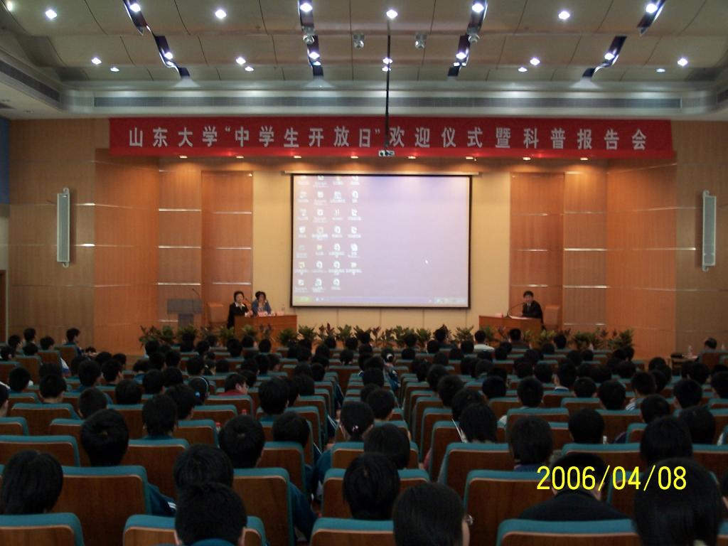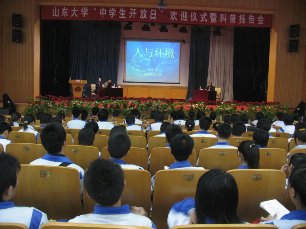 上午十点半,中学生开放日欢迎仪式暨科普报告会分别在东校区科学会堂和西校区综合楼讲学厅举行。方宏建、樊丽明分别代表学校致欢迎词,介绍了山东大学的悠久历史和目前的概况,重点向中学生们介绍了山东大学人才培养方面的教育拓展、三种经历、暑期学校、第二次选择专业等创新举措,热情欢迎中学生朋友来山东大学做客,来山东大学参观、学习。学生代表高原、孔令艺向中学生们介绍自己在山东大学学习、生活的经历和感受。中国工程院院士王文兴教授,全国三八红旗手标兵、医学院陈子江教授分别在两个校区作了主题为《人与环境》、《生命的起源》的科普报告。