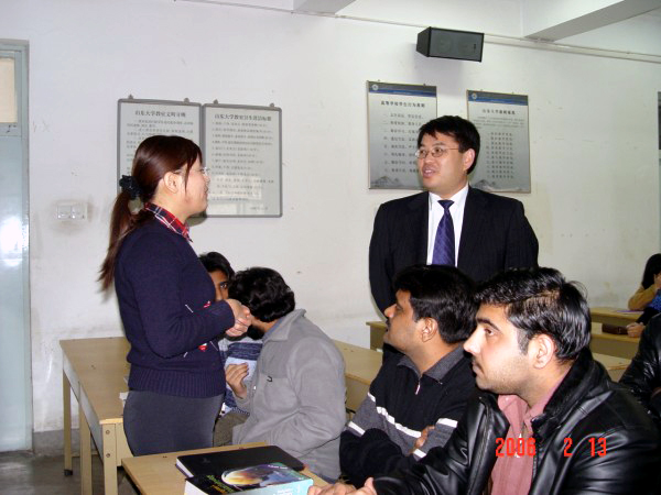 下午1:30,校长展涛和医学院、校长办公室有关负责人一起,首先来到西校区教学八楼8106教室,听取了医学院马榕老师讲授的《手术学》。马榕老师授课幽默风趣,生动形象而又不失严谨缜密;学生听课认真,积极主动;在轻松活跃的课堂氛围中,老师和学生之间形成了良好的互动。课间休息时,展涛同授课老师进行了亲切交谈。随后,展涛一行又来到西校区图书楼东202教室,听取了郝爱军老师为留学生讲授的《组织胚胎学》全英文课程,并同授课老师和来自不同国家的留学生们进行了交流和讨论。