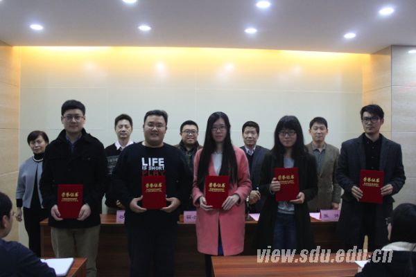 王德胜向环球时报对文学院的支持表示感谢,向获奖学生表示祝贺。王德胜说,《环球时报》是人民日报社主办的一份时事报刊,在国内外有着广泛的影响力,自创刊以来一直支持中国高等教育的发展,关注青年学生的成长,学院十分重视与《环球时报》的联系和合作,相信环球时报和文学院的合作会结出新的硕果,希望同学们珍惜荣誉,打造过硬的基础知识,培养创新能力和实践能力。薛小乐说,设立环球时报公益奖学金的目的是为国养士,希望和文学院未来的合作更深入,能有更多同学了解、认识甚至加入《环球时报》,融入对国家、社会和命运的思考。张帅宣读了《关于表彰2014—2015年度环球时报奖学金获得者的决定》,公布了本次“环球时报奖学金”获得者的名单。与会嘉宾和学院有关负责人为获奖者颁发荣誉证书,并一起合影留念。获奖学生代表、2013级研究生武晨雨在发言中回顾了自己的大学时光,阐述了对自己肩上责任的认识,表示在未来的日子里将继续努力学习和工作,以报答社会各界和领导老师的关心。