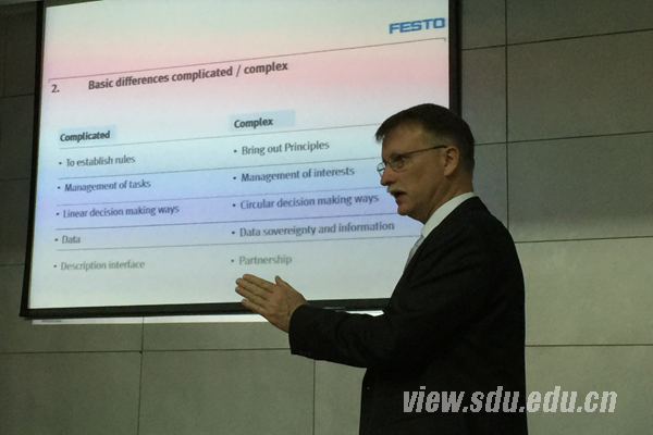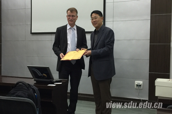 [本站讯]11月16日至17日,德国FESTO项目管理专家Dieter Wiesner教授到机械学院进行为期两天的交流培训。德国FESTO是世界气动行业第一家通过ISO9001认证的企业,在项目管理领域具有很高的水平,培训会前机械学院副院长李方义教授为其颁发了山东大学机械学院客座教授聘书。