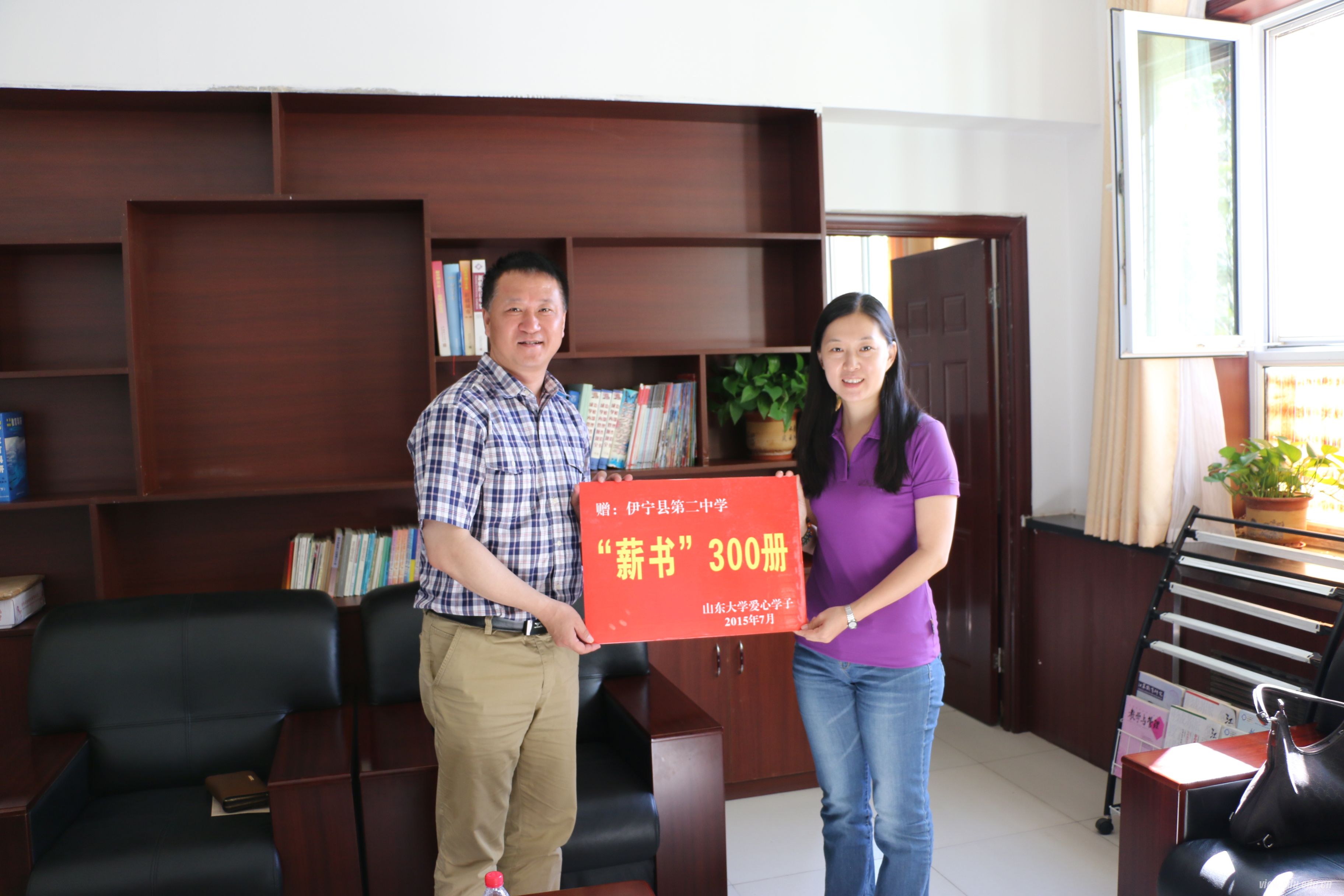 在伊宁县二中,马晓琳还代表山东大学爱心学子向学校捐赠了“薪书”300册,充实由支教团设立在伊宁县二中的“山东大学薪书书架”。