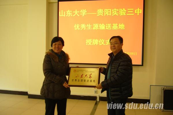 [本站讯]近日,山东大学哲学与社会发展学院赴贵州省开展教育拓展活动,先后在贵阳市第三实验中学、贵阳市第六中学举行了山东大学优秀生源输送基地授牌仪式,同时举行了名师报告会和招生宣讲会。