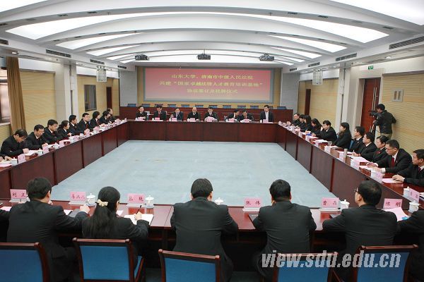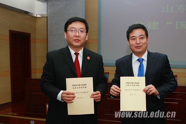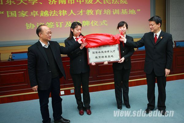 [本站讯]1月15日,山东大学与济南市中级人民法院共建“国家卓越法律人才教育培养基地”协议签订及挂牌仪式在济南中院举行。山东大学校长助理廖品琥与济南中院院长李勇出席签字仪式致辞,并签署了关于建设国家卓越法律人才教育培养基地协议,为基地揭牌。