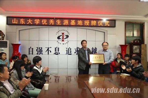 优秀生源基地挂牌仪式上,山东大学河南省教育拓展负责人、医学院副院长刘传勇介绍了山东大学基本情况。他重点介绍了学校的办学目标、办学格局、学校环境及本科人才培养理念,突出了山东大学历史底蕴丰厚、学科专业齐全、办学实力雄厚等特点以及学校“三跨四经历”等办学特色。各中学校领导对山东大学在本校设立优秀生源输送基地表示感谢,并表示以后一定加强与山东大学的交流与合作,争取为山东大学输送更多的优秀人才。
