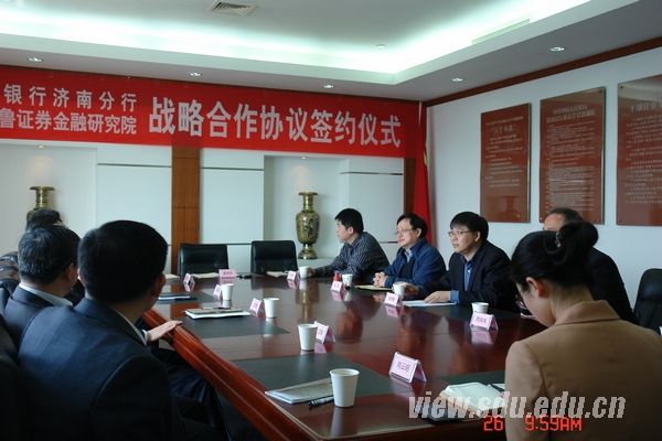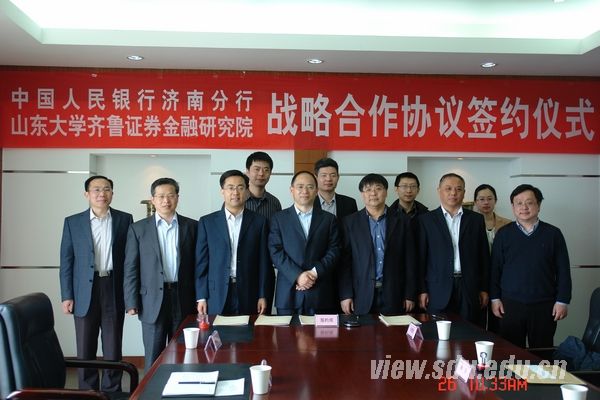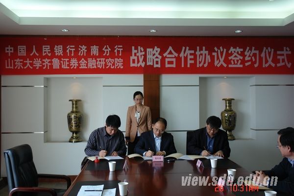 [本站讯]4月26日,山东大学金融研究院与中国人民银行济南分行战略合作协议签约仪式在中国人民银行济南分行进行。山东大学金融研究院院长陈增敬、中国人民银行济南分行副行长肖龙沧等参加了签约仪式。