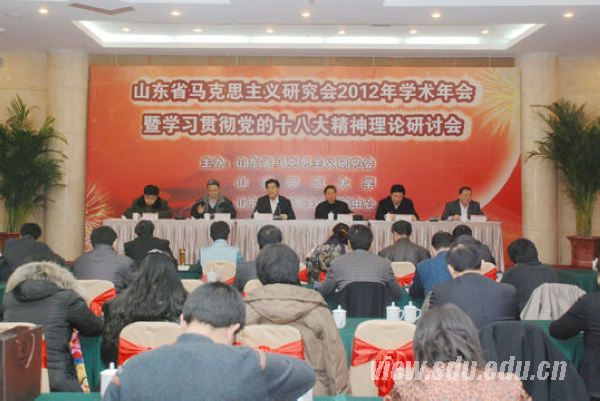 [本站讯]12月26日,山东省马克思主义研究会2012年学术年会暨学习贯彻党的十八大精神理论研讨会在山东师范大学举行,山东大学马克思主义学院周向军教授、刘明芝教授、刘雅静教授、陈家付教授、林红副教授、车美萍副教授、张爱波副教授、张立华副教授和王瑜老师等应邀参加会议。周向军教授主持会议。