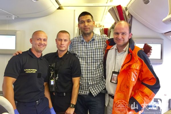 当我正在休息时,我听到飞机广播里在请求医务人员的帮助。我一听到就清醒了,很快走到机组人员旁边。一位年轻的中国女乘客正在浑身发抖,很痛苦。当我表明自己是个医生,并把我的证件交给总乘务长Demon Virginie时,他们告诉了我那个女乘客的情况。因为我会说汉语,我就开始和她交流。感谢我在山大的老师们,他们说过学习语言总是很有用。这个女乘客有严重的呕吐、血压和体温过低症状,这很有挑战性,因为飞机上的资源是有限的。我对她实行急救,放了一个氧气面罩帮助她呼吸,给她盖上毯子,然后定期监测她的体温、血压和脉搏。