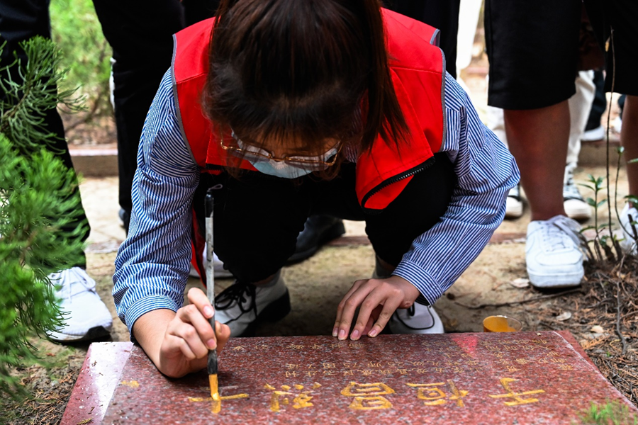 参观过烈士陵园,在工作人员的协助下,我们开始为英烈碑文描金。从调制描金材料到用毛笔一笔一划描摹,我慢慢地静下心,感受历史的厚重。工作人员又让我们看了一位70多岁的老党员,跪在墓碑旁,聚精会神地描摹着墓碑,她的眼睛似乎在诉说着过去,见证着信仰。看着这位老奶奶,我的思绪似乎又飘向了那个战火纷争的年代,感受着属于他们的热血青春……岁月和风雨可以磨损墓碑上的碑文,但英烈的精神永远不会褪色,永远闪烁在人民的心中。