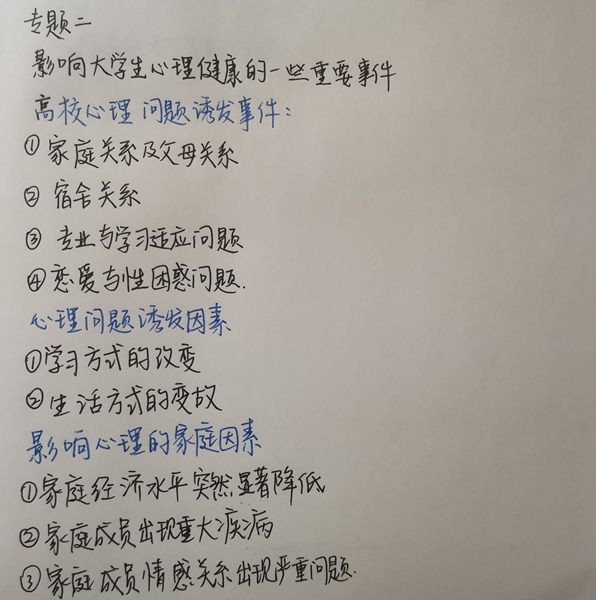 专题二“影响大学生心理健康的一些重要事件”像展开不同心理诱因的星图。那些看似平常的家庭关系、宿舍关系、专业与学习适应问题等,在课程中化作具体坐标。理论学习让我们更好地了解自我、了解他人,让我们在看见他人愁眉不展时,能关注到背后可能的原因。