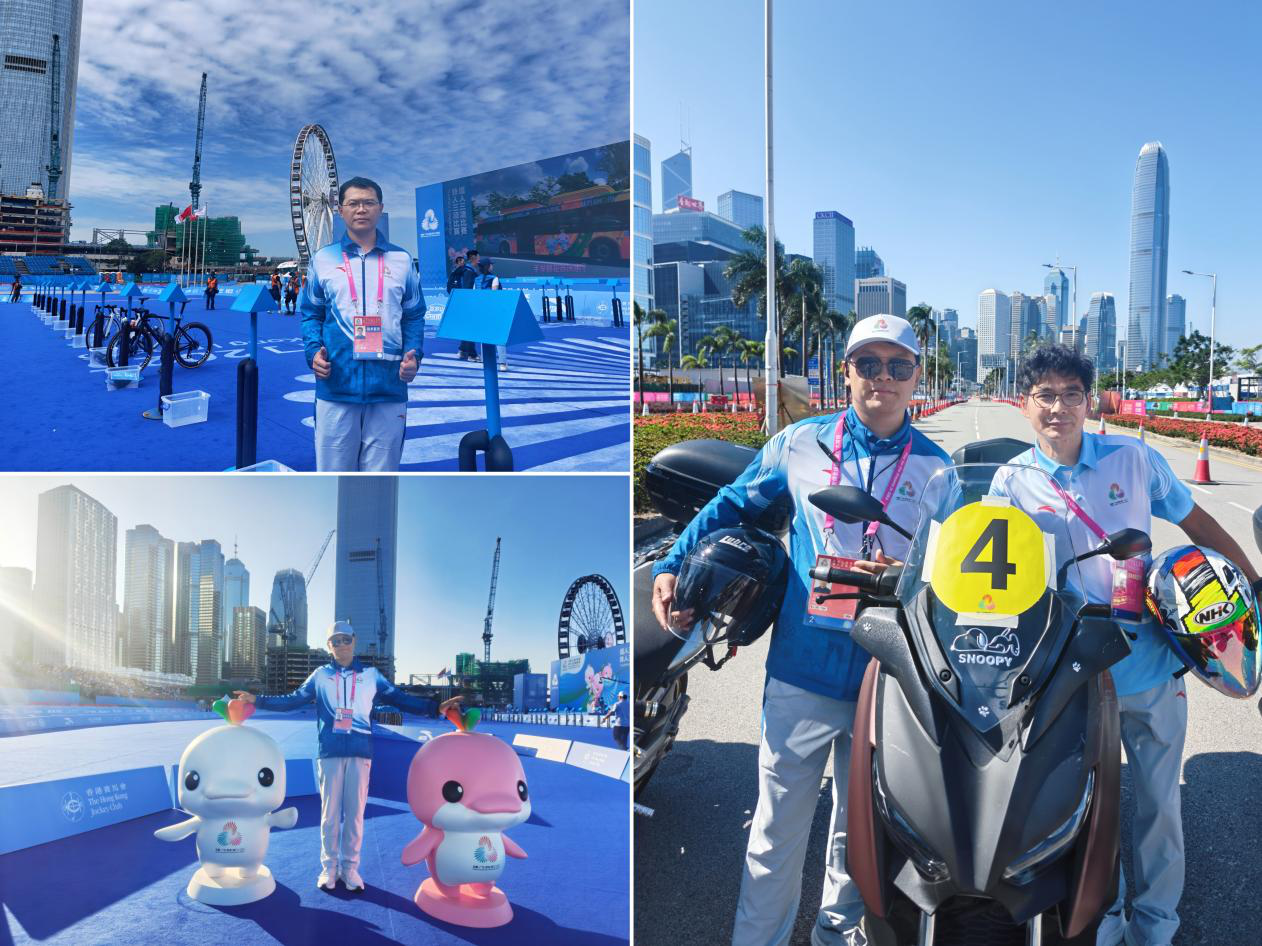 第二天的混合接力比赛,共有15支代表队的60名运动员参加,每个棒次运动员均需完成300米游泳、6.6公里自行车及1.8公里跑步。相较于个人赛,混合接力距离更短、节奏更快,对裁判的反应要求也更高。比赛开始,运动员们你追我赶的车队如箭矢般掠过,破风前行,与身后蔚蓝的维港和对岸九龙的天际线,构成了一幅力与美、体育与城市交融的画卷。我的第二岗位是为第一名运动员拉起终点冲线带,当我看到一直处于微弱劣势的山东队终于在第四棒张玺瑞的努力下完成超越,第一个向终点门冲刺而来的时候,我的“山东血脉”支配着我,忍不住在心里提前给山东队竖起了大拇指。获得第二名的香港队在赛后也主动向山东队表示祝贺,这一幕温暖又感人。
