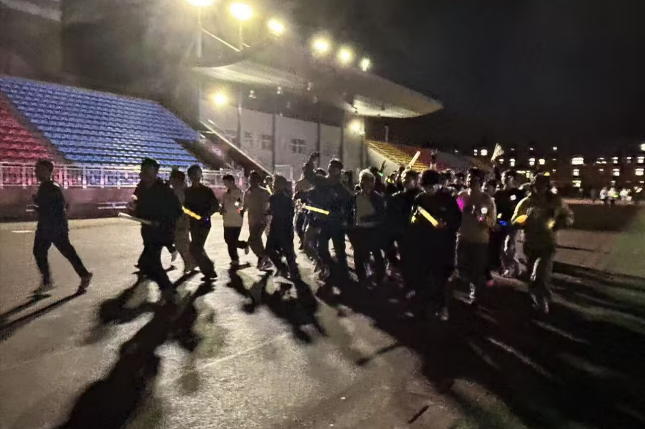 昨晚,我和同学周鹏洋走到操场时,这里已经聚满了人。我们排队领取了胸章和手环,操场上的灯光交织在一起,将深秋的寒意隔绝在外,每个人脸上都洋溢着十二分的热情。