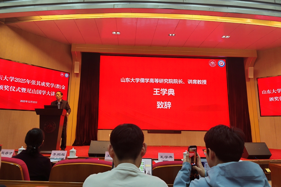 两点钟仪式准时开始。王学典院长致辞后,李平生教授介绍了张其成奖(教)学金的设立初衷与发展历程,并宣读了本届获奖名单。他巧妙地用“一九二九”的童谣比喻人生的不同阶段,鼓励我们在青春正好的年华刻苦学习,将个人成长融入中华民族伟大复兴的征程。他还深情回顾了尼山学堂的建立历程,以及学堂在培养古典学术人才方面的努力与成果,让我深深感受到国学传承的当代意义。