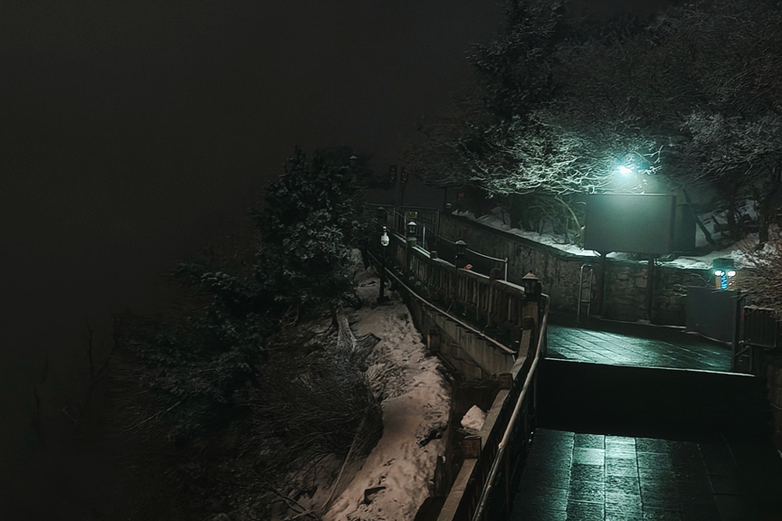 真正的考验从十八盘开始。石阶陡峭,雨水湿滑,每抬一步都得小心翼翼。记不清雨是什么时候变成雪的,只记得快到南天门时,打在脸上的不再是冰冷的雨滴,而是细密的雪粒。凌晨四点半,我们终于登上南天门。雪还在下,细细密密,在灯光中飞舞。我们找了一处避风的屋檐,五个人挤在一起,裹紧湿漉漉的羽绒服等待天明。没有人说话,但每个人都在想:这么大的雪,明天还会有日出吗?