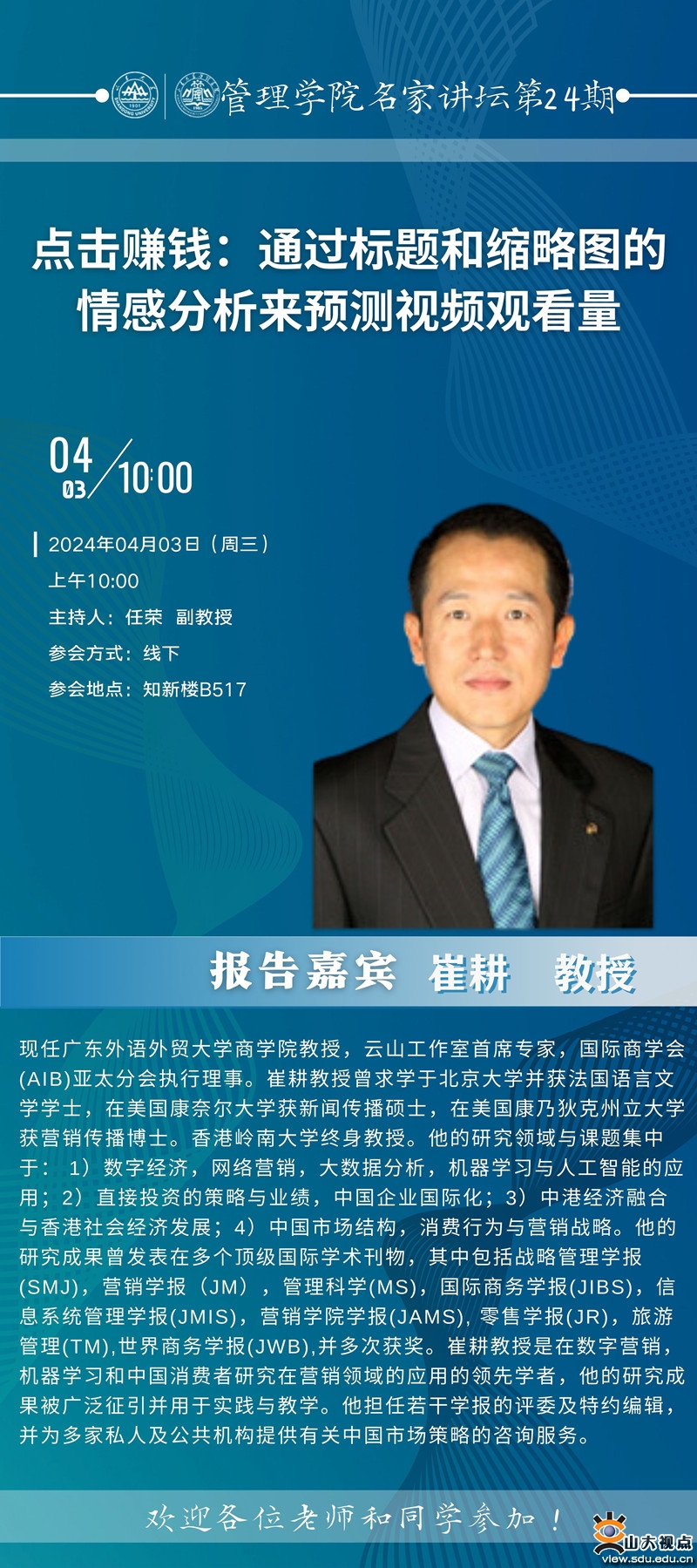 管理学院名家讲坛第24期:通过标题和缩略图的情感分析来预测视频观看量
