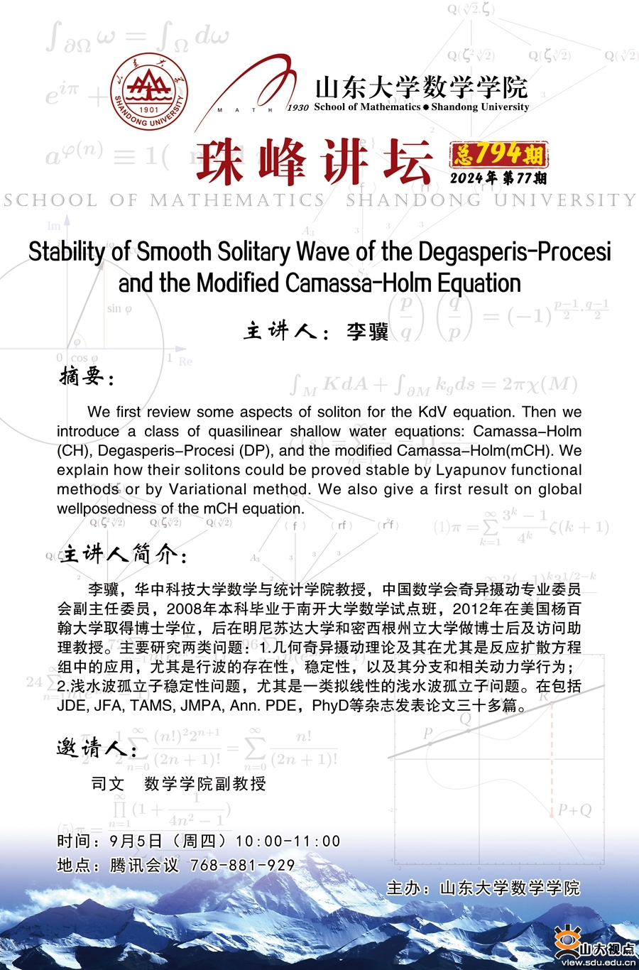 数学学院珠峰讲坛第794期:Stability of Smooth Solitary Wave of the Degasperis-Procesi and the Modified Camassa-Holm Equation