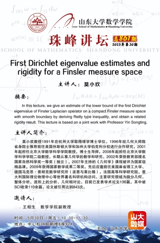 数学学院珠峰讲坛第861期:First Dirichlet eigenvalue estimates and rigidity for a Finsler measure space