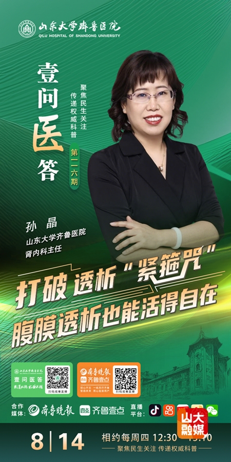 直播简介:数据显示,我国慢性肾脏病患者人数约有1.2亿。慢性肾脏病一旦进入终末期肾病阶段,患者只能通过透析或肾脏移植来维持生命。而透析方式的选择,对患者生活质量影响深远。腹膜透析作为重要的透析方式之一,能够让患者在居家环境中完成治疗,减少往返医院的奔波,并且操作相对简便,能帮助患者更好地维持正常的生活节奏。8月14日12:30,山东大学齐鲁医院肾内科主任孙晶将走进《壹问医答》,详细讲述腹膜透析的相关知识,敬请关注。