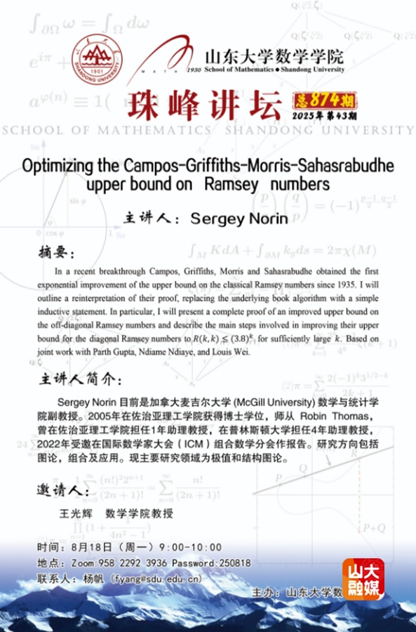 数学学院珠峰讲坛第874期:Optimizing the Campos-Griffiths-Morris-Sahasrabudhe upper bound onRamseynumbers