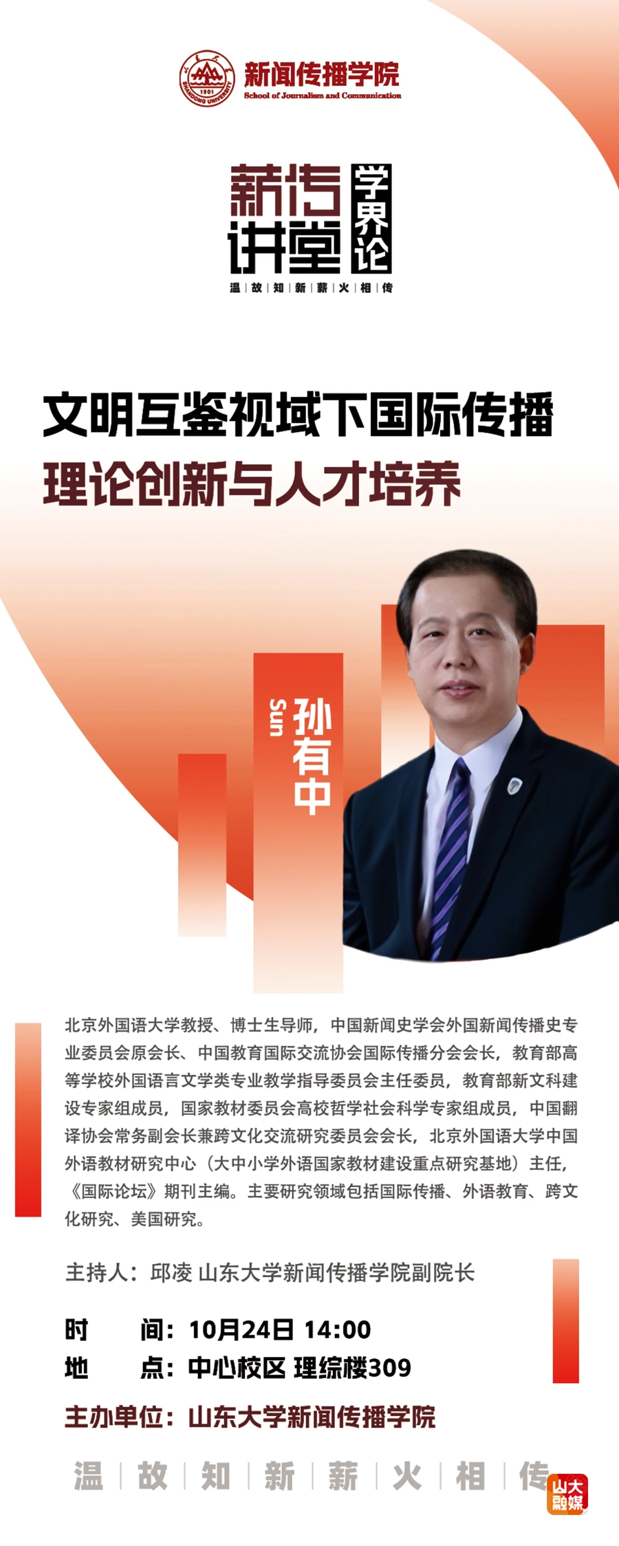孙有中,北京外国语大学教授、博士生导师,中国新闻史学会外国新闻传播史专业委员会原会长、中国教育国际交流协会国际传播分会会长,教育部高等学校外国语言文学类专业教学指导委员会主任委员,教育部新文科建设专家组成员,国家教材委员会高校哲学社会科学专家组成员,中国翻译协会常务副会长兼跨文化交流研究委员会会长,北京外国语大学中国外语教材研究中心(大中小学外语国家教材建设重点研究基地)主任,《国际论坛》期刊主编。主要研究领域包括国际传播、外语教育、跨文化研究、美国研究。