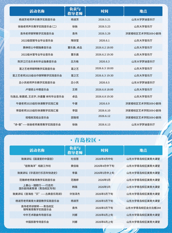 本届艺术展演季既是山东大学艺术学院教学成果的集中展示,也是学院以美育人、以文化人的生动实践。多样的艺术形式、丰富的展演内容,既为学子搭建了锤炼专业能力、展现艺术风采的实践平台,也让艺术之美浸润校园,持续丰富校园文化生态,助力师生在审美熏陶中涵养人文情怀、提升艺术素养。