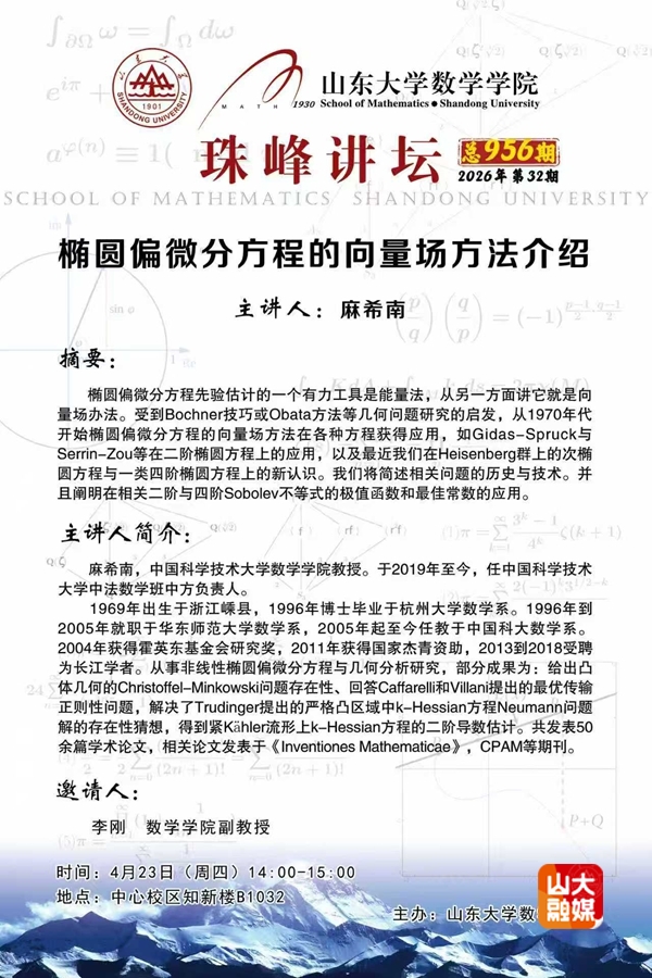 数学学院珠峰讲坛第956期:椭圆偏微分方程的向量场方法介绍
