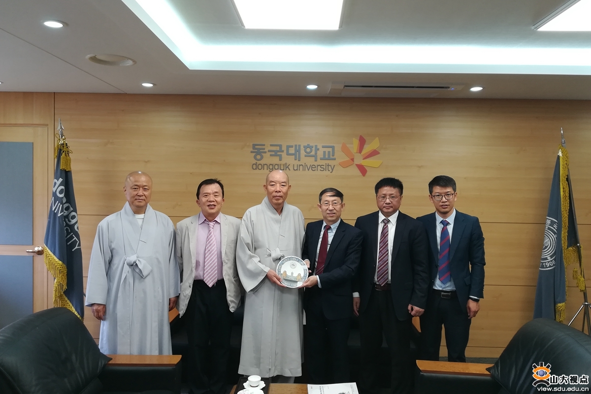 6月7日上午,陈坚教授、牛建科教授、李海涛副教授会见了东国大学校长韩泰植(普光)、东国大学佛教学院院长申景贤教授、东国大学佛教学院原院长宗浩法师等,双方交换了彼此对于东亚佛教的认识,希望通过两校间的学术交流推动中韩佛教学术研究的发展。代表团向东国大学赠送了山东大学校景盘及中心主办的学术刊物《犹太研究》和《东亚宗教》。韩泰植也为山东大学代表团赠送了纪念品。