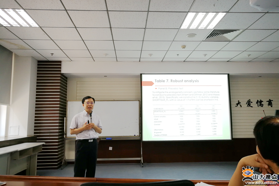 [本站讯]7月3日,对外经济贸易大学祝继高教授受邀访问山东大学管理学院,并进行学术交流,为学院师生作了题为“Two tales of earnings management with short selling deregulation”的学术报告。报告由管理学院副院长路军伟教授主持,学院近百名学生参加了本次学术报告。