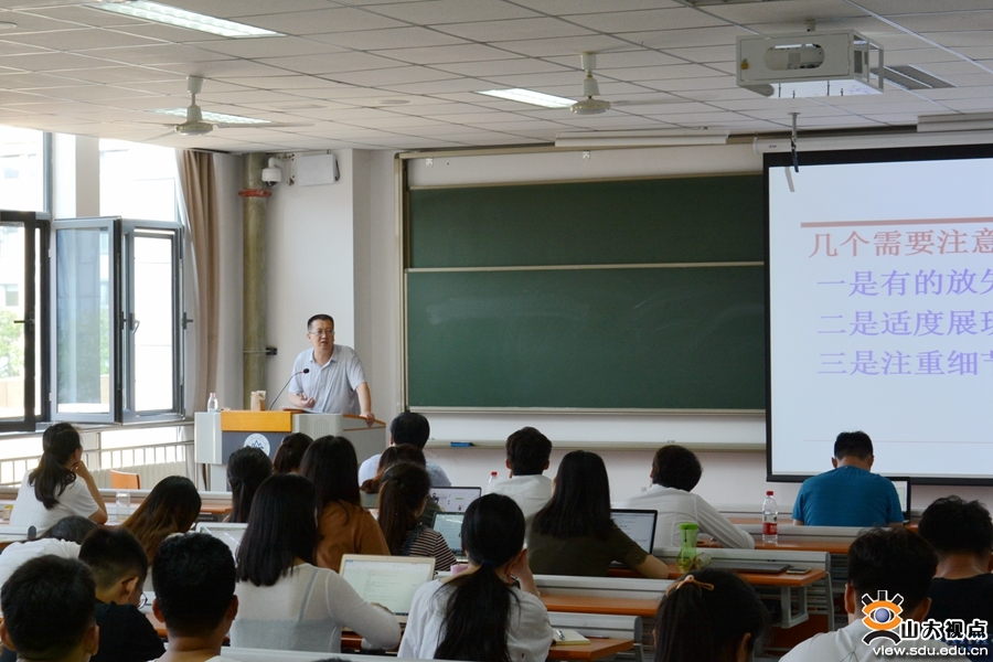[本站讯]7月5日,政管学院“研究生学术能力提升计划”系列讲座第一场在青岛校区振声苑举行,中共山东省委党校教授、《理论学刊》(CSSCI)主编谭建为同学们作了主题为“如何让自己的学术论文打动编辑”的报告,学院副院长刘昌明主持讲座。
