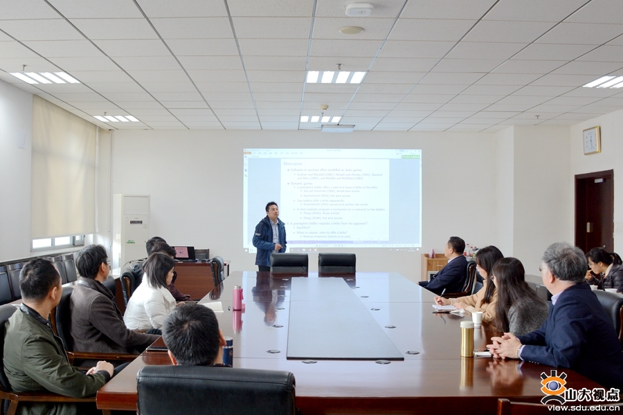 午餐会上,经济学院助理研究员卢宗威作了题为“Requesting a Bribe in Second Price Auctions”的学术报告。报告首先梳理了之前的静态博弈拍卖模型中的串谋行为和简单动态模型中先发制人的竞标者提供的要么接受要么放弃贿赂的选择,两个竞标者依次提出贿赂和第三方调停等已有的拍卖理论。其次,报告提出了一种两个竞标者第二价格拍卖模型,该模型假定第一位竞标人有机会(或者commit to) 提出一个要么接受要么放弃的索贿请求,如果对方接受贿赂,他在拍卖时出价为零,如果他拒绝贿赂,他们在接下来的拍卖会上会采取不合作的态度出价。报告得出在索贿金额为外生时,该动态不完全信息博弈存在均衡解。当贿赂的提出者可以自由选择索贿金额时,当且仅当提出者相对较强并且不是太强时,存在合理的共谋精炼均衡,并且低支付意愿的提出者更可能索贿,高支付意愿的人更可能行贿。