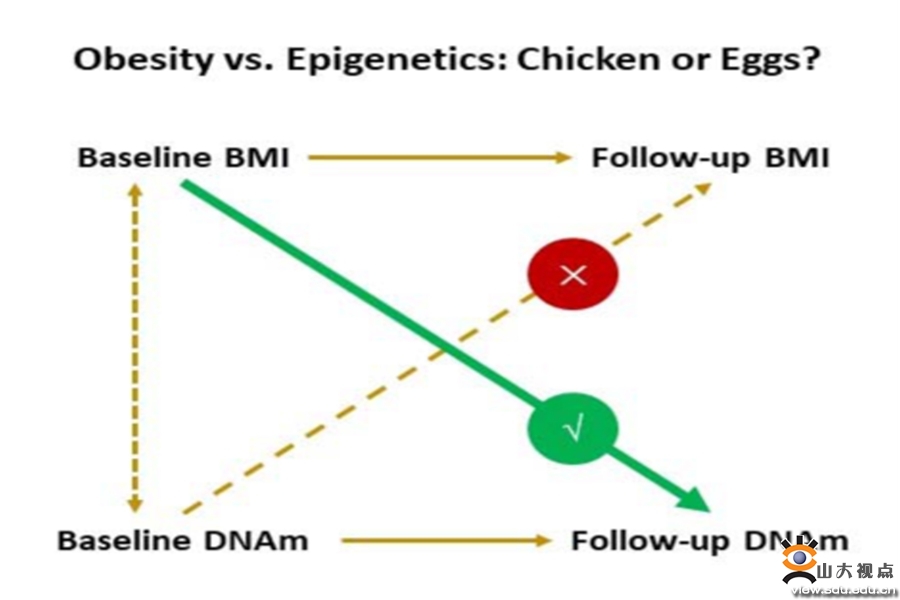 在发现队列和验证队列的人群样本中,白人中349个CpG位点(266个新位点)和黑人中36个CpG位点(21个新位点)被确定与BMI密切相关,两个种族之间有8个(1个新位点)重叠。交叉滞后时序分析发现,在白人的18个CpG位点和黑人的7个CpG位点上存在显著的从基线体重指数到随访DNA甲基化的单向路径(PFDR<0.05),而没有发现从基线DNA甲基化到随访体重指数的显著路径。基线体重指数与随访DNA甲基化评分(由相关CpG位点的DNA甲基化水平计算得到)显著相关(在黑人和白人中P<0.001)。本研究结果有力地证明肥胖是DNA甲基化动态变化的原因,而不是结果。