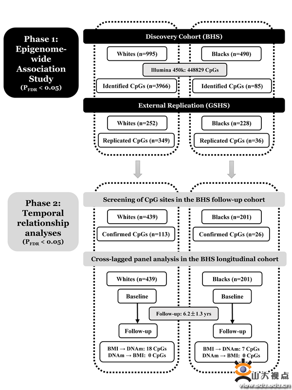 以往的全表观遗传组关联研究(Epigenome-wide association study, EWAS)表明,肥胖可能是DNA甲基化变化的原因,而不是结果,然而缺乏纵向观察的人群研究证据。本研究目的一是确定与体重指数(BMI)相关的CpG甲基化位点,二是在纵向重复测量队列中研究DNA甲基化和体重指数动态变化之间的时序关系(Temporal Sequence)。本研究首先在Bogalusa心脏研究中针对995名白人和490名黑人进行了种族特异性的EWAS研究,并进一步对Georgia Stress and Heart Study队列中的252名白人和228名黑人进行了重复验证。第三阶段,基于Bogalusa心脏研究纵向队列中的439名白人和291名黑人间隔6.2年的两次重复测量数据,使用交叉滞后时序分析(Cross-lagged panel analysis)检验DNA甲基化变化与体重指数改变的时序因果关系。