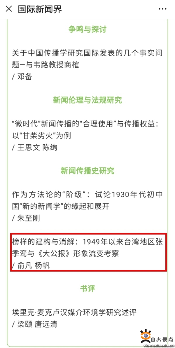 [本站讯]近日,新闻传播学院俞凡教授以第一作者身份在权威期刊《国际新闻界》(CSSCI)(2019年第10期)发表题目为《榜样的建构与消解:1949年以来台湾地区张季鸾与<大公报>形象流变考察》的学术研究文章。
