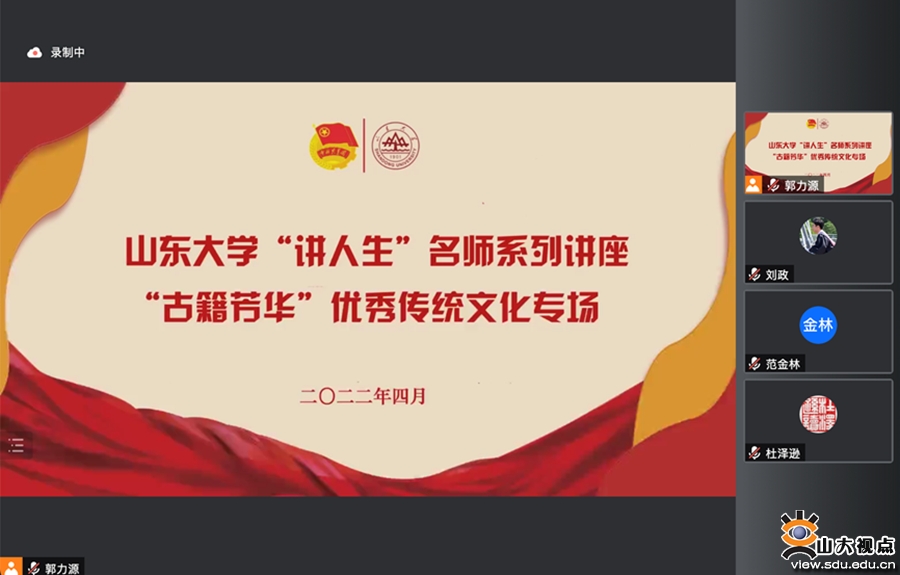 [本站讯]为促进学生对优秀传统文化的了解,营造浓厚的校园学术文化氛围,4月22日晚,校团委指导山东大学学生会、儒学高等研究院学生会举办“讲人生”名师系列讲座之“古籍芳华”优秀传统文化专场讲座,山东大学讲席教授杜泽逊带来题为“国学传统与当代文化建设”的专题讲座。本次讲座共吸引来自80余所院校近700余位师生线上观看。讲座由校团委范金林老师主持。