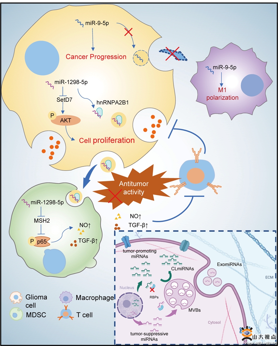 研究者在本文中对代表性外泌体型miRNAs miR-1298-5p进行了深入研究,发现miR-1298-5p可以通过靶向SetD7影响AKT信号通路来抑制胶质瘤的增殖能力,胶质瘤细胞通过外排蛋白hnRNPA2B1将miR-1298-5p分泌到外泌体中从而将其排出肿瘤细胞,促进肿瘤的恶性进展。为了进一步研究抑癌的miR-1298-5p对免疫微环境的作用,我们在髓系来源的免疫抑制细胞(MDSCs)中过表达miR-1298-5p。有趣的是,我们发现miR-1298-5p还可以促进MDSCs的免疫抑制能力,从而进一步促进肿瘤的恶性进展。