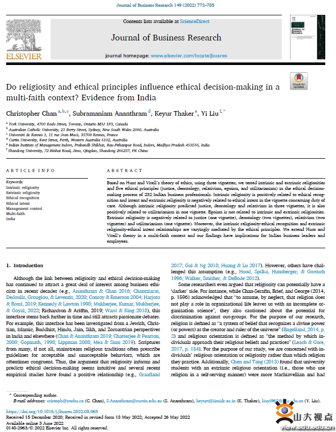 [本站讯]近日,国际创新转化学院刘怡副教授作为唯一通讯作者的学术论文Do religiosity and ethical principles influence ethical decision-making in a multi-faith context? Evidence from India,在商学领域国际重要期刊Journal of Business Research(国际工商领域A类SSCI期刊,JCR一区,五年的影响因子达8.488,在商业期刊的排名28)2022年第149卷发表。