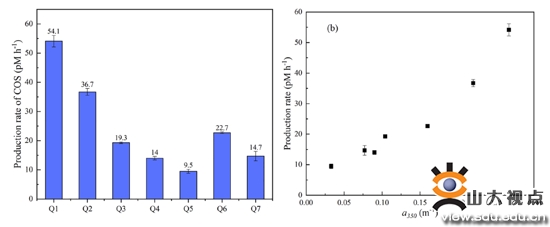研究结果表明,印度洋东部海域不同寡营养盐站位表层海水的COS光化学产生速率存在明显差异。此外,拟合结果显示调查站位有色溶解有机物(CDOM)浓度(用海水在350 nm的吸光度表示,a350)越高,COS的光化学产生速率越大。上述结果说明,海水表层COS的光化学产生除了与溶解有机硫浓度有关外,海水CDOM也是触发表层COS产生的内在“驱动因子”之一。